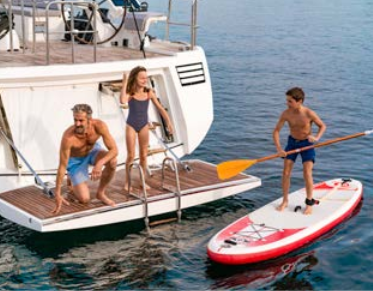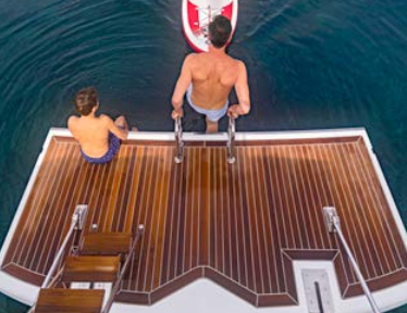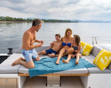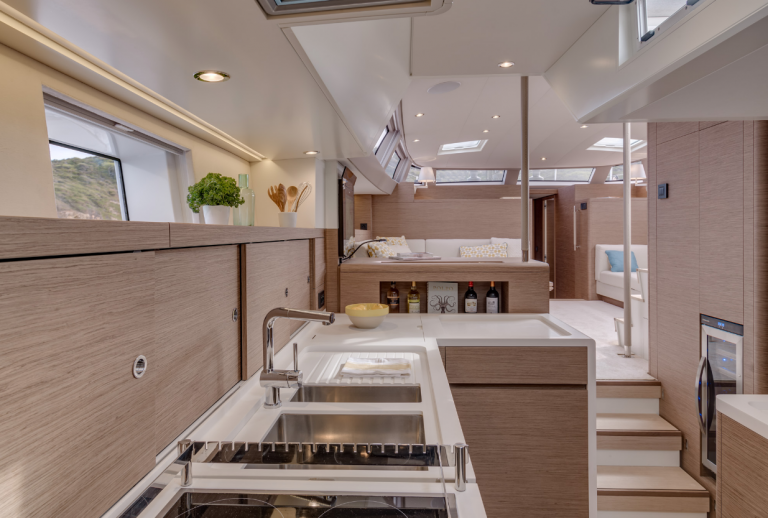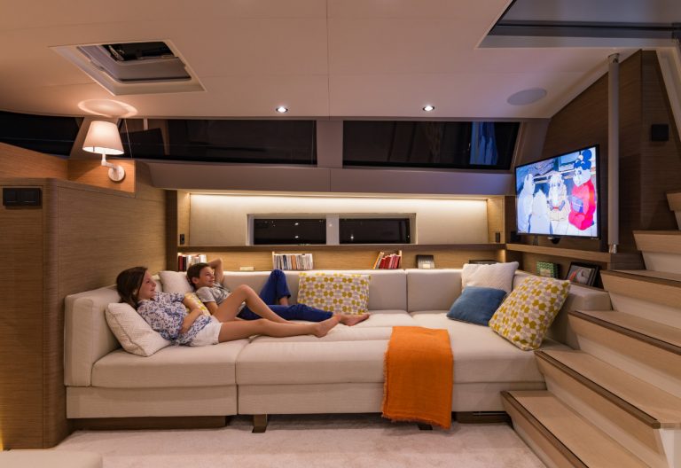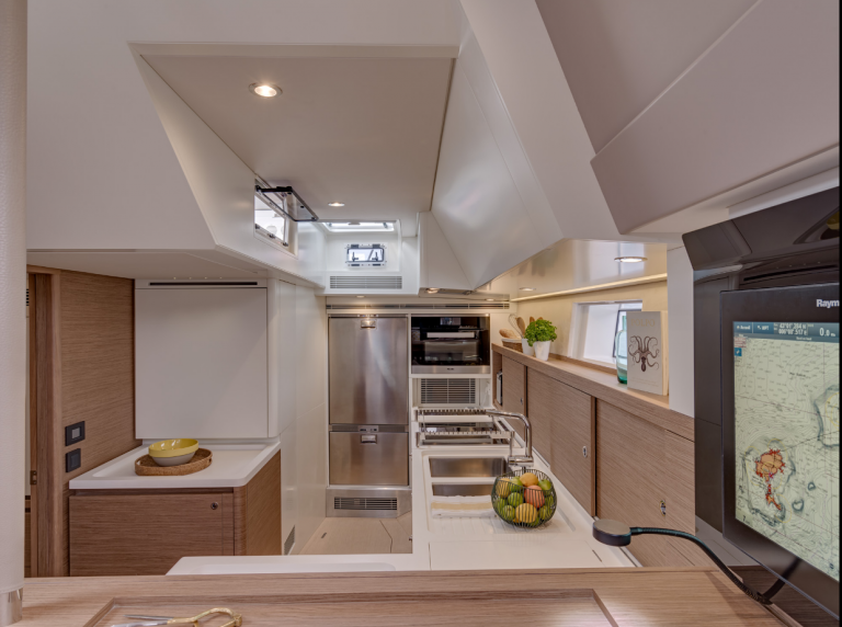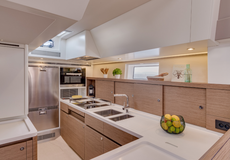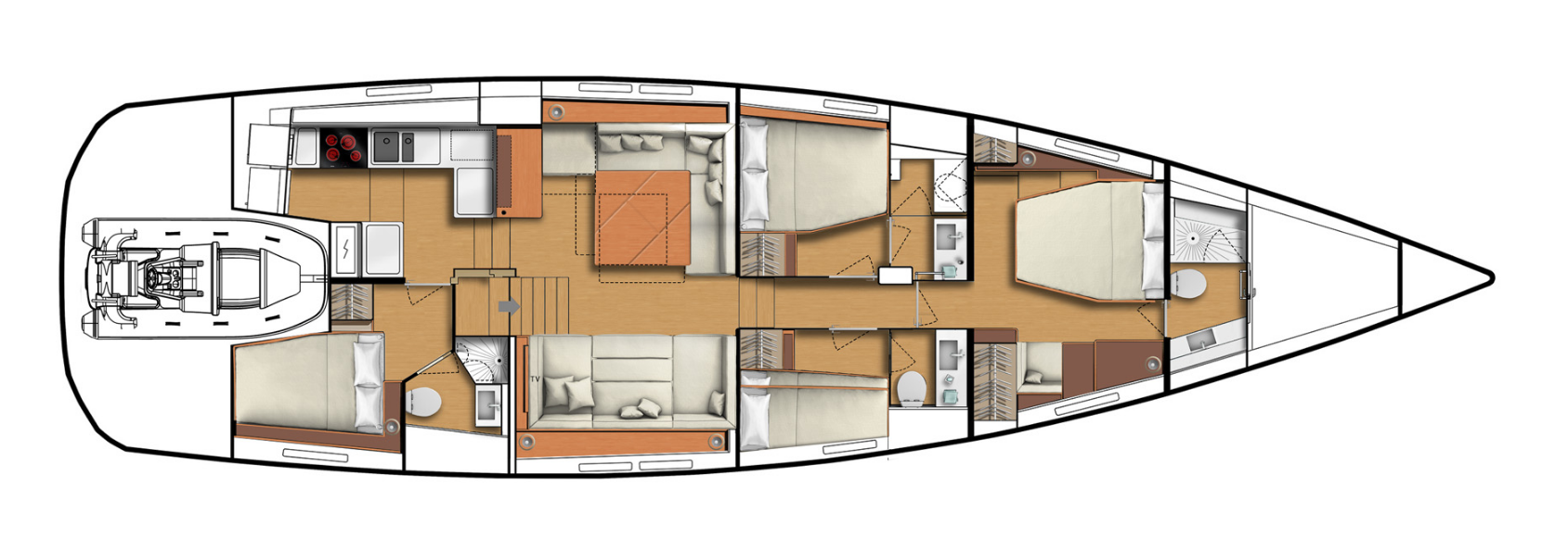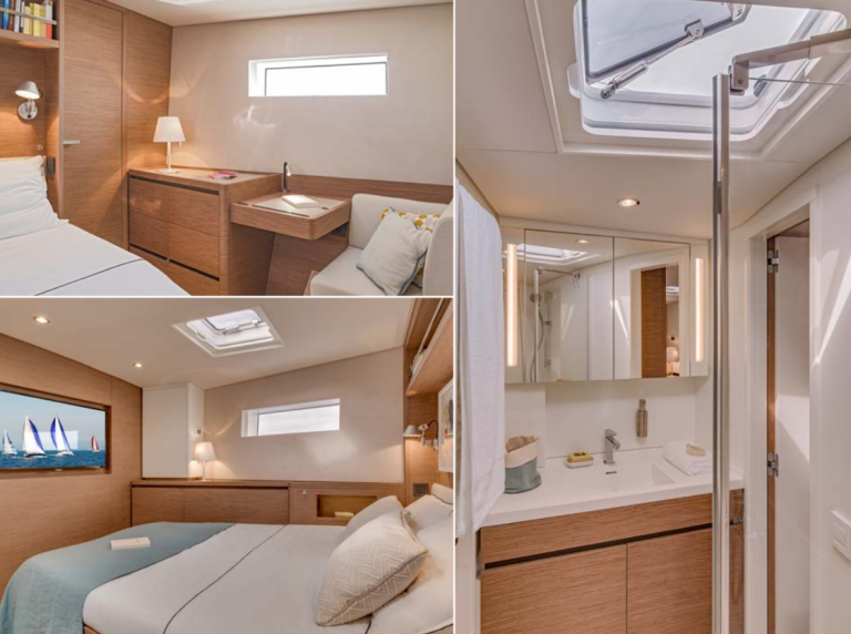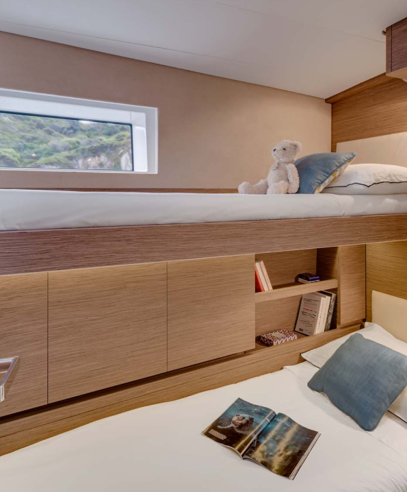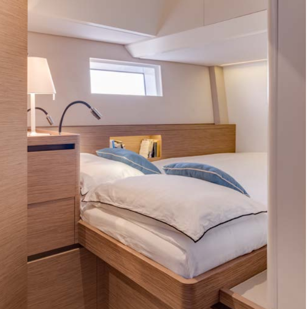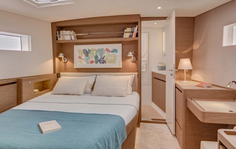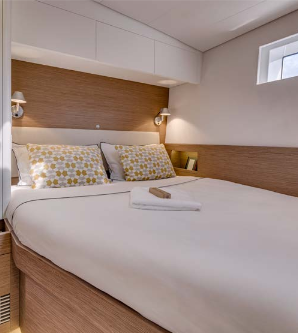 The owner’s suite is endowed with a non-centered bed, for more comfort and intimacy. The clever layout allows a large storage capacity without compromising the aestheticism of the cabin. The suite has an en-suite bathroom which is bright and has an elegant layout for an optimum comfort.